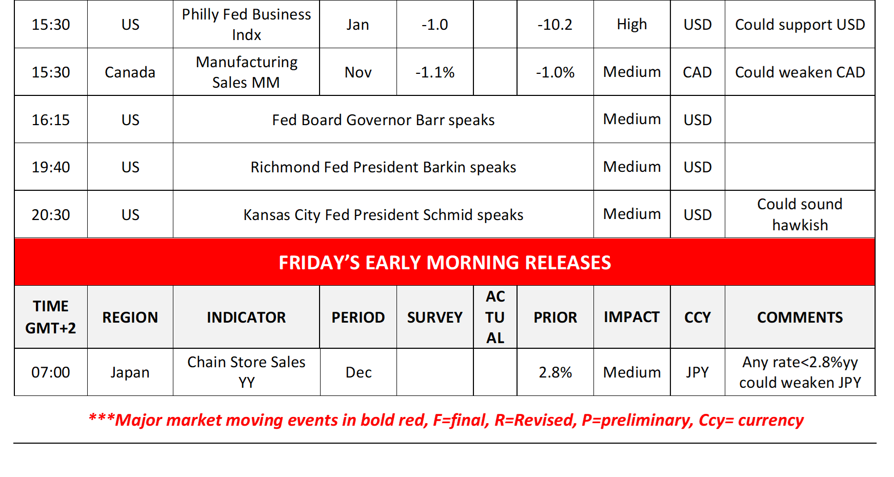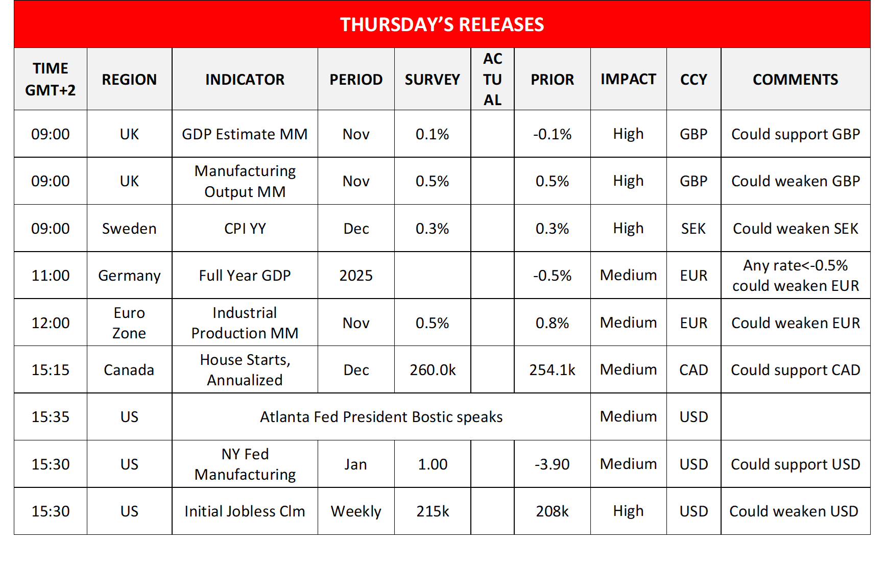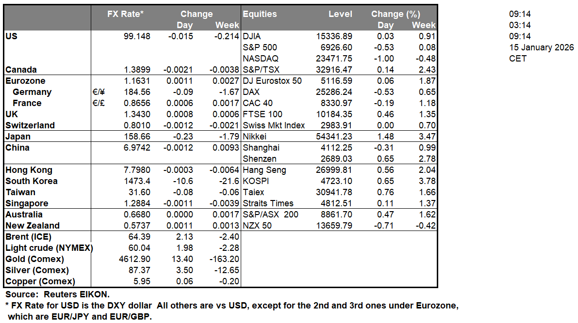 Today we get the UK GDP and manufacturing output growth rates for November, Sweden’s CPI rates for December, Germanys’ full year GDP rate for 2025, Euro Zone’s industrial output for November, Canada’s House Starts for December and Manufacturing sales for November, while from the USD we note the release of the NY Fed Manufacturing index for January, the weekly initial jobless claims figure and the Philly Fed Business index for January. On a monetary level, we note that Atlanta Fed President Bostic, Fed Board Governor Barr, Richmond Fed President Barkin and Kansas City Fed President Schmid are scheduled to speak. In tomorrow’s Asian session, we get Japan’s Chain Store Sales for December.